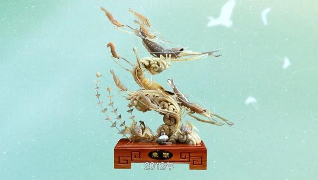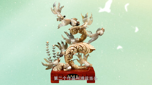 白耀华跳出技法桎梏,让自己的作品住进海洋的磅礴,融入岁月的厚重:看那《春潮》里的虾蟹,细肢如发丝,薄壳能透光,仿佛下一秒就会从牛角中跃入海浪;再瞧《鸿运当头》的鱼鳞都借天然角料的莹润光泽,雕出了波光粼粼的效果!