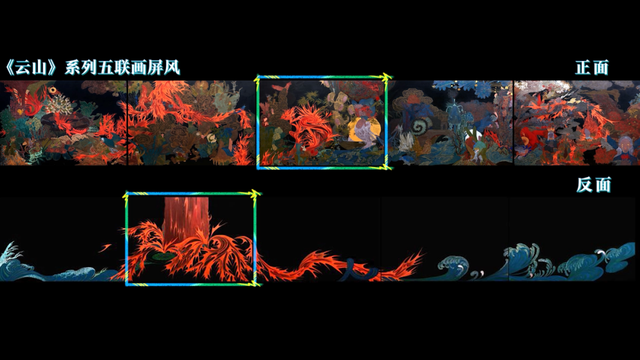 “画面中描绘了一场山火蔓延至山谷的剧烈景象,而幻想的‘我’则飞升至云端吹泡泡。”钟琳这样介绍她的毕业设计作品,在这《云山》系列的长卷里,山火中飞舞的毕方鸟、水中倒立的神女、跳动的山火,全是用“大漆+矿物颜料”的跨界技法绘就。