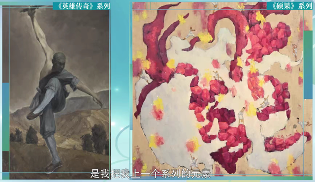 当年过五十的黄向前走进演播厅,没人能想到这位自称“石榴大叔”的70后艺术家,笔下藏着两个世界——一边是刀光剑影的英雄江湖,一边是饱满多汁的石榴王国。这两种看似不相关的题材背后,其实隐藏着他一以贯之的创作理念:中国传统文化(符号)在当代艺术中的借用和演绎。