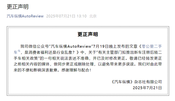 近日,有关媒体报道称工信部拟推出新车登记6个月内禁止转手的新规,引发网友热议。对此,《汽车纵横AutoReview》发布更正声明,指出相关说法表述不准确,并已进行修改。