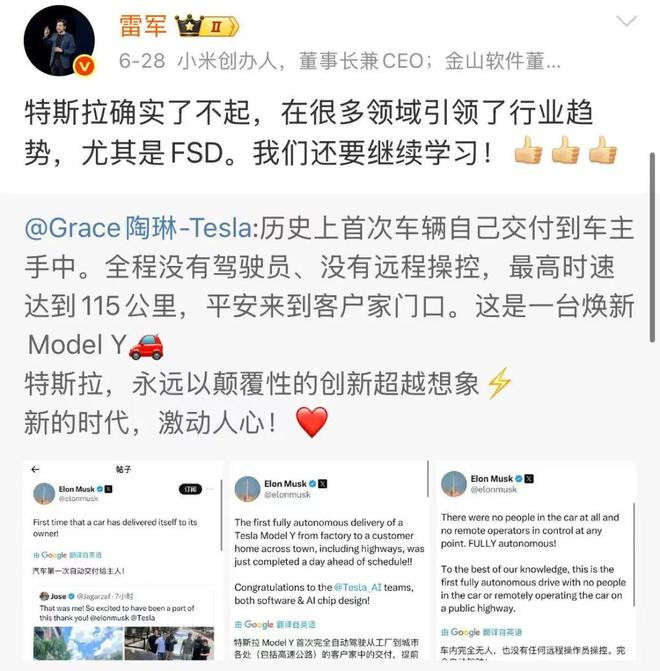 上个月底,雷军转载了特斯拉副总裁陶琳的微博,夸赞特斯拉在很多领域引领力行业趋势,“特斯拉确实了不起,在很多领域引领了行业趋势,尤其是FSD。我们还要继续学习”。![]()