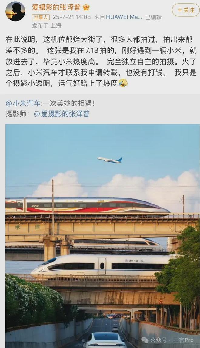 对此,照片拍摄者本人回应称:在此说明,这机位都烂大街了,很多人都拍过,拍出来都差不多的。这张是我在7.13拍的,刚好遇到一辆小米,就放进去了,毕竟小米热度高。 完全独立自主的拍摄。火了之后,小米汽车才联系我申请转载,也没有打钱。