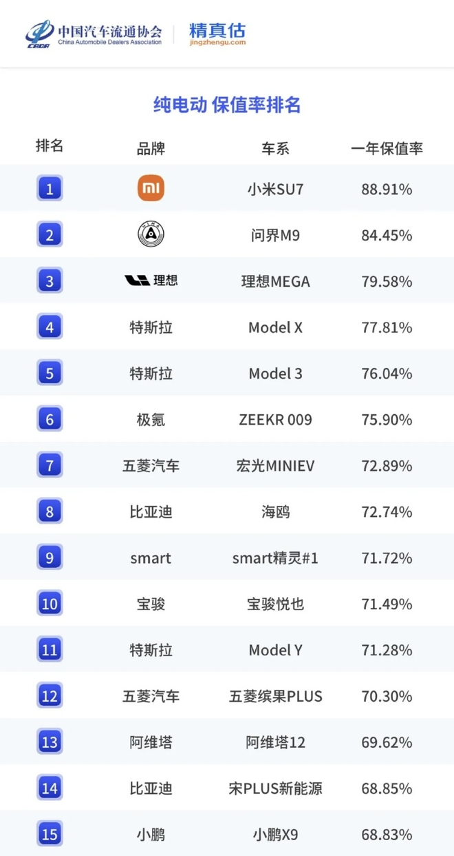 7月21日,小米副总裁李肖爽微博发文,援引中国汽车流通协会和精真估联合发布的《2025上半年中国汽车保值率研究报告》数据,宣布小米SU7一年保值率为88.91%,在所有纯电车型中排名第一。