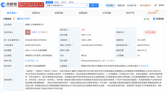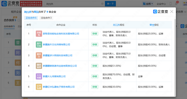 近日,刘元杰名下新疆本粟商贸有限公司因未依照规定的期限公示年度报告,被库尔勒经济技术开发区市场监督管理局列入经营异常名录。此外,刘元杰关联的新疆甜蜜富特电子商务有限公司、新疆妮酱试试电子商务有限公司、新疆大七传媒有限公司已于近期注销。