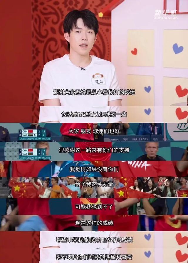 最后王楚钦也表达了对球迷们支持的感谢:“无论是从小看我打球的球迷,包括后面逐渐认识我的球迷,很感谢一路以来你们的支持,如果没有你们给予我这种力量,可能我也到不了现在的成绩,希望未来我能取得更好的成绩,不辜负你们的期待和信任。”