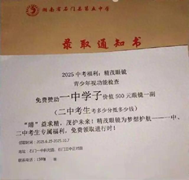 7月中旬,有学生家长反映情况称,湖南常德多所中学向新生寄送的高中录取通知书中,夹带了眼镜店广告宣传单,引发关注。有家长表示,录取通知书应该是个比较严谨的事情,出现这个会造成一定不良影响。