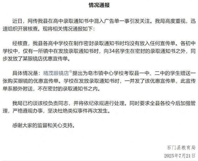 针对此事,7月21日石门县教育局发布情况通报称,经核查,该县各高中学校在制作密封录取通知书时均没有放入任何宣传单。各初中学校中,仅有一所镇中在发放录取通知书时,向34名学生在密封的录取通知书之外,同步发放了某眼镜店优惠宣传单。石门县教育局已约谈相关学校负责同志,并将依纪依规进行处理。