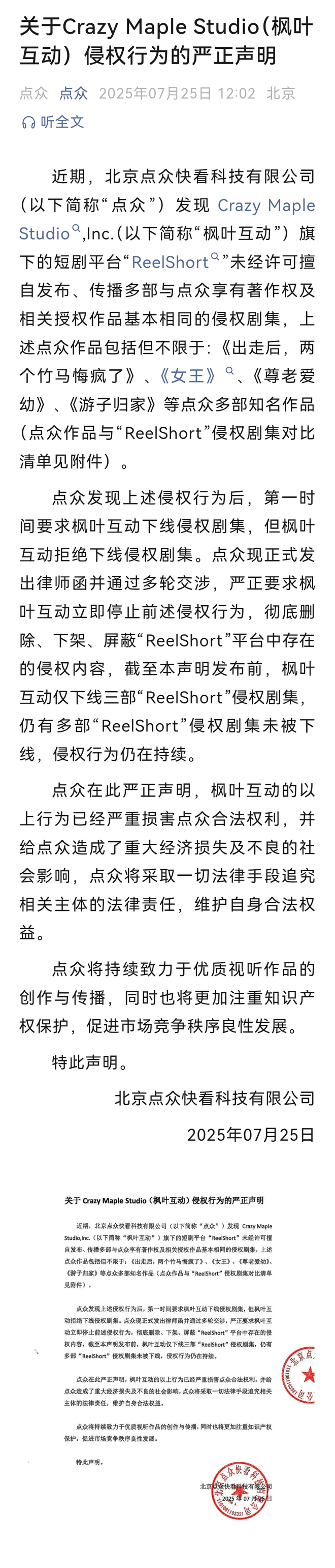 7月5日,点众发布声明称,Crazy Maple Studio, Inc.(枫叶互动)旗下的短剧平台“ReelShort”未经许可发布和传播了多部与点众享有著作权的作品基本相同的侵权剧集,包括《出走后,两个竹马悔疯了》《女王》《尊老爱幼》《游子归家》等。