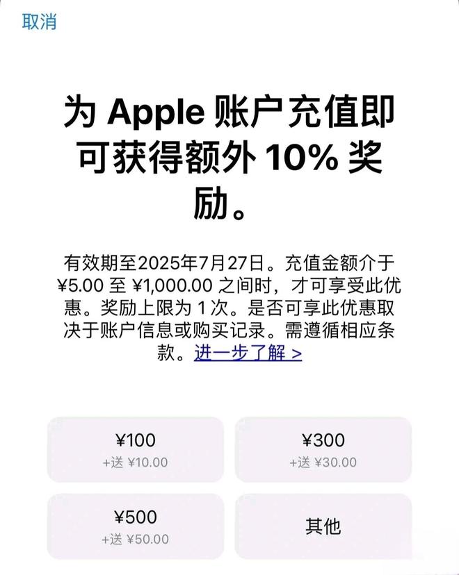7月25日,苹果App Store推出账户充值限时优惠活动,有效期至7月27日。活动期间,用户充值金额介于5元至1000元时,可享受额外赠送10%的优惠,奖励上限为1次。例如充值100元送10元,充值300元送30元,充值500元送50元。App Store账户余额可用于订阅Apple Music、iCloud、购买游戏和App等服务。