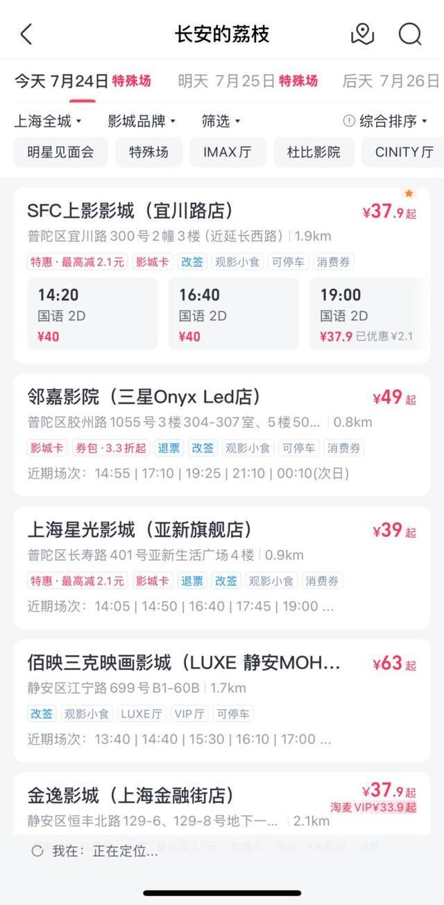 为了实测购买电影票后能不能退票、退票难不难,澎湃新闻“马上测”分别在淘票票、猫眼、美团、大众点评、京东选择SFC上影影城(新世界店)、佰映三克映画影城、国泰电影院、上海星光影城亚新店购买了暑期档热门电影《长安的荔枝》24小时内相近场次的电影票。