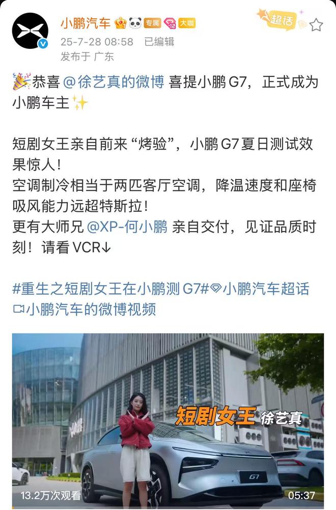 今日,小鹏汽车官宣短剧女王徐艺真成为小鹏G7车主,并发布了她亲自体验小鹏G7的视频。视频中,徐艺真亲自参与测试了小鹏G7空调制冷消息和辅助驾驶等功能。测试完后,大师兄何小鹏亲自为徐艺真交车。
