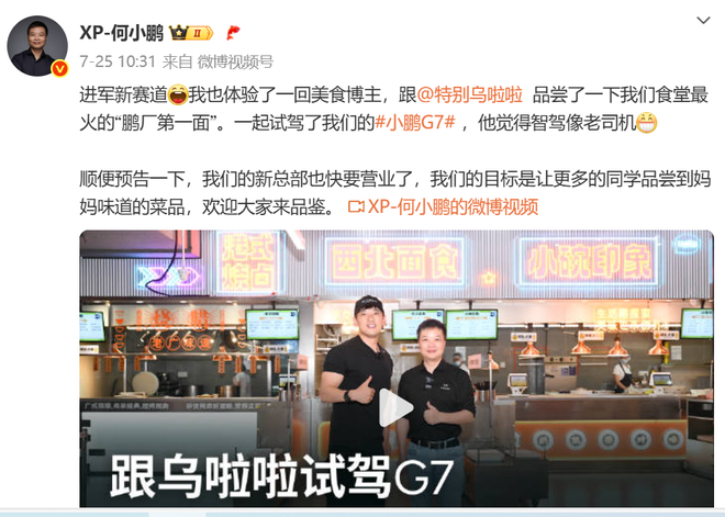 值得注意的是,上周何小鹏还邀请了百万粉丝美食博主参观小鹏食堂。