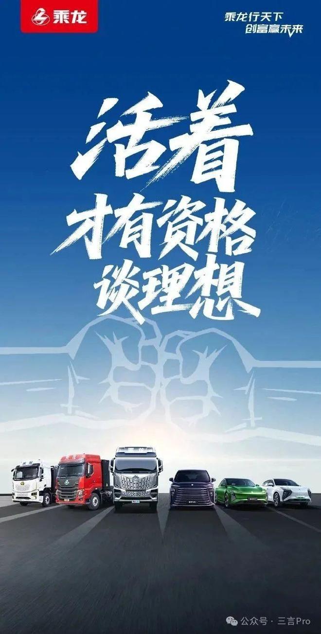 今日,三言发现乘龙卡车再发海报内涵理想汽车,海报写着“活着才有资格谈理想”。