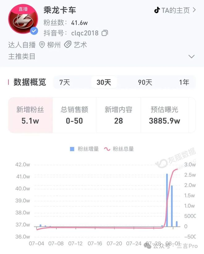 三言注意到,乘龙卡车的抖音账号从7月30至今已经涨粉5万。而在此前,其粉丝增长几乎停滞。