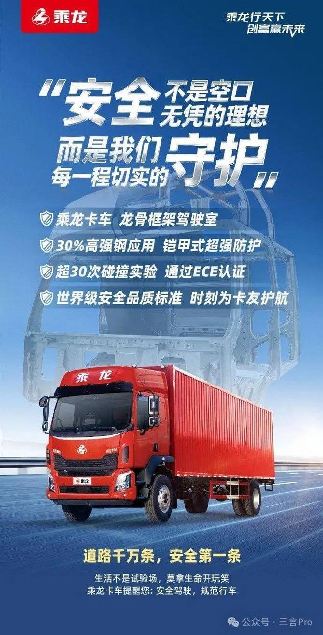 昨日的海报上写着“安全不是空口无凭的理想,而是我们每一程切实的守护”、“道路千万条,安全第一条。生活不是试验场,莫拿生命开玩笑。乘龙卡车提醒您:安全驾驶,规范行车。”