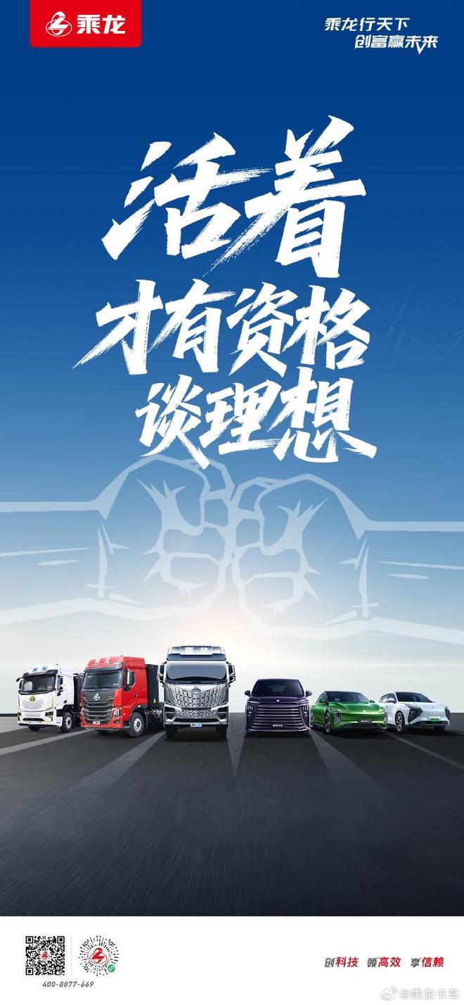 今日,乘龙卡车再发海报内涵理想汽车,“活着才有资格谈理想”。