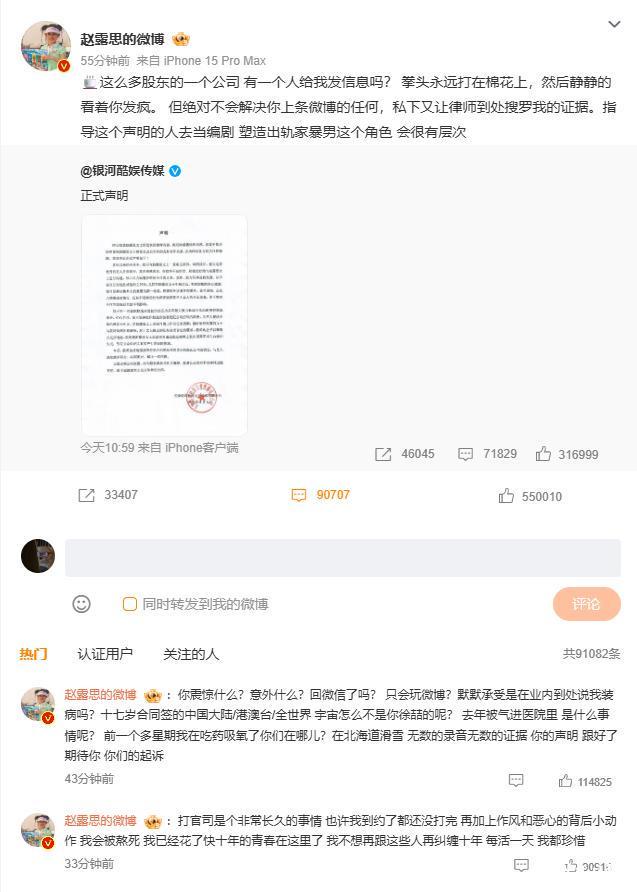 随后,赵露思转发该声明,并配文绿茶表情包称:“这么多股东的一个公司,有一个人给我发信息吗?”此后,赵露思又在微博下评论数条内容。
