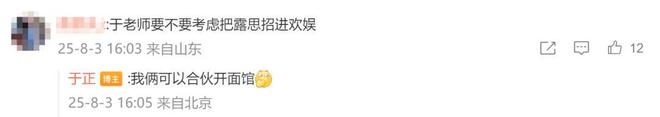 3日下午,知名编剧于正在其个人微博评论区就赵露思的相关热搜回复网友称:“我俩可以合伙开面馆”。