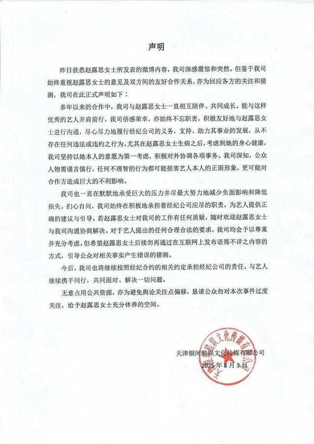 8月3日上午,@银河酷娱传媒 发布声明,内容如下: