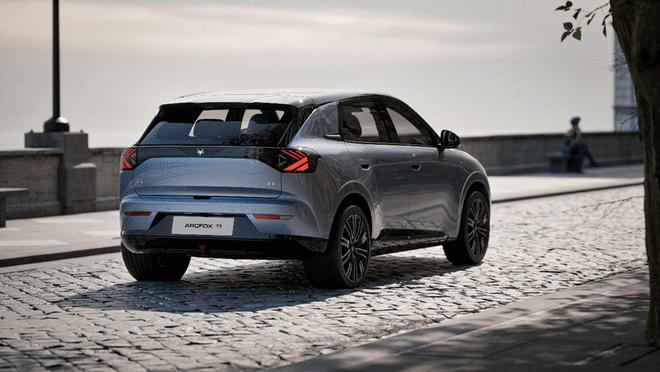 侧面配备18英寸多幅式轮毂与悬浮车顶设计,提供黑色外后视镜壳、半隐藏式门把手,双色车身(黑顶+亮色车身)强化运动氛围。车尾采用贯穿式黑色饰板+多层斜杠尾灯,点亮后极具视觉冲击力。此外,新车尾门右侧带有“T1”产品标识,后牌照框底部带有黑色包围,包围中央带有雾灯。