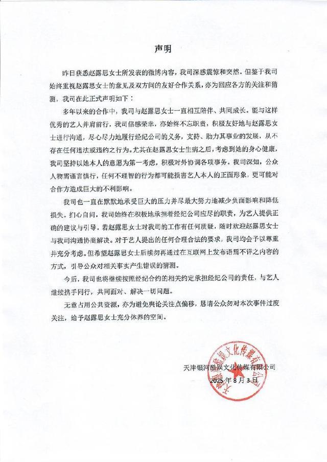 针对赵露思的言论,银河酷娱于8月3日上午发表了一份声明。声明中称,对于艺人提出的任何合理合法的要求,公司均会予以尊重并充分考虑。