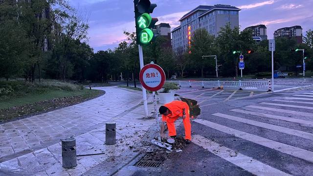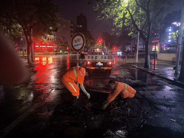 身着橘红色市政防汛服的他们在第一时间到达现场后,不顾漫流的脏臭雨水,使用防汛工具迅速清理收水井上淤积的枝叶杂物,遇到难以清理的大块障碍物,就俯下身子浸入水中徒手清捞。经过一个多小时的来回巡查、清理、排放水,加快了该区域收排水的速度,使南北两侧的道路积水水位迅速下降。6日凌晨两点多,该区域积水完全消退。