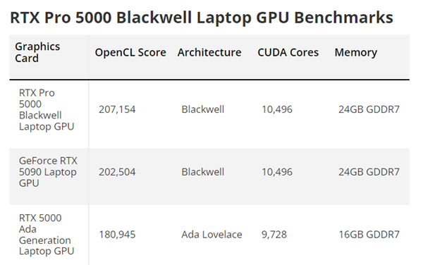 在性能方面,RTX Pro 5000 Blackwell移动版在OpenCL测试中获得了207,154,比其前代产品RTX 5000 Ada移动版快了14%。