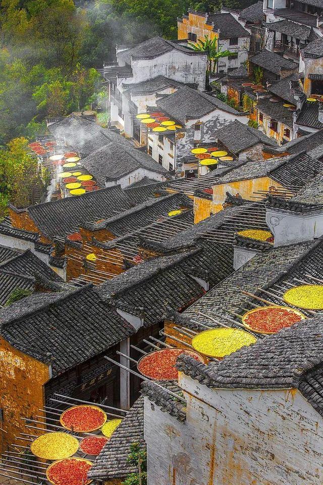 赤红的辣椒、金黄的玉米、澄亮的南瓜片