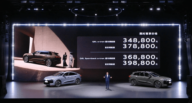 Q6L e-tron家族包括Q6L e-tron及Q6L Sportback e-tron两大系列,官方指导价34.88-39.88万元。新车采用专属长轴距设计,轴距达2995mm,较海外版增加105mm,后排空间媲美D级轿车;Sportback版本采用溜背造型,风阻系数低至0.26,兼顾美学与效能。当然,这并非它的亮点所在,作为奥迪与保时捷联合开发的PPE豪华纯电平台打造的产品,它有着华为智驾深度赋能同时还有107度宁德时代三元锂电池的支撑。