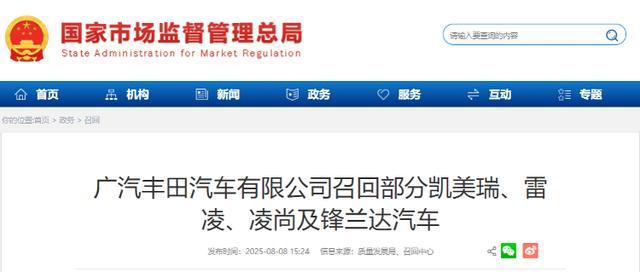 8月8日,据市场监管总局网站,日前,广汽丰田汽车有限公司根据《缺陷汽车产品召回管理条例》和《缺陷汽车产品召回管理条例实施办法》的要求,向国家市场监督管理总局备案了召回计划。