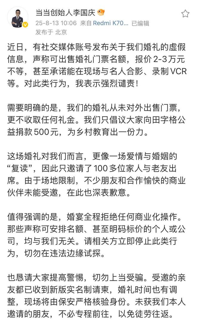 李国庆官宣婚礼改期:只邀请100多人,现场保安核验身份