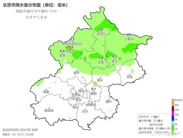 13日08时-11时,最大降水量出现在延庆东龙湾25.8毫米。目前东北部地区的主要回波正逐渐移出。预计,午后山区有阵雨或雷阵雨,傍晚我市有分散性雷阵雨天气,请注意防范。