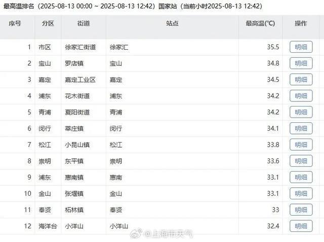 今天9时,徐家汇又挤入全国气温榜单,并一度摘得榜首。东南风作用下,气温区域差异还是有些大的,宝山,嘉定再冲一冲就能上35度了。