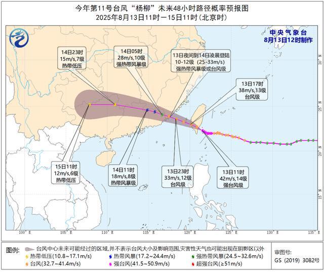 中央气象台发布消息:今年第11号台风“杨柳”(强台风级)的中心已于今天(8月13日)13时前后在台湾台东县太麻里乡沿海登陆,登陆时中心附近最大风力14级(42米/秒),中心最低气压955百帕。