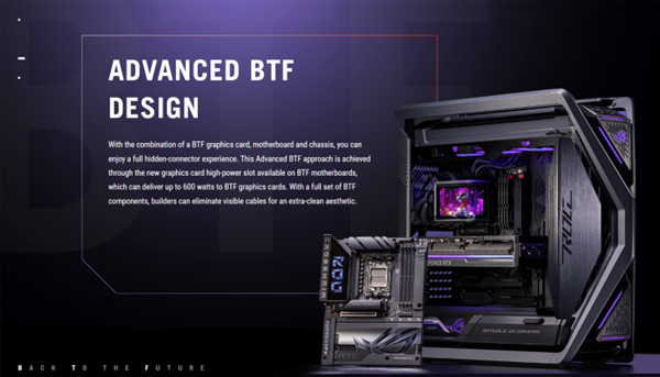 BTF特性方面,几乎所有连接器都位于主板背面,仅部分风扇接口位于前面,还配备了支持高达600W功率传输的显卡高功率插槽,可与华硕或第三方BTF卡配合使用。