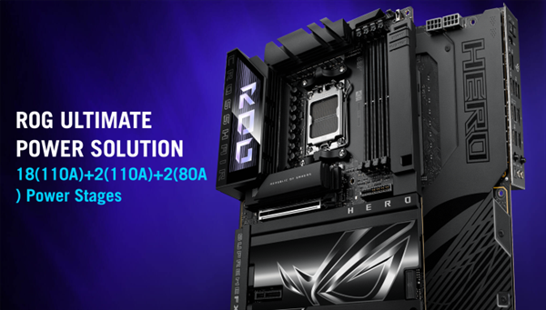这款主板继承了HERO系列的所有超频和发烧级特性,采用18(110A)+ 2(110A)+ 2(80A)22相供电,能够为AMD处理器和DDR5内存提供出色的超频支持。