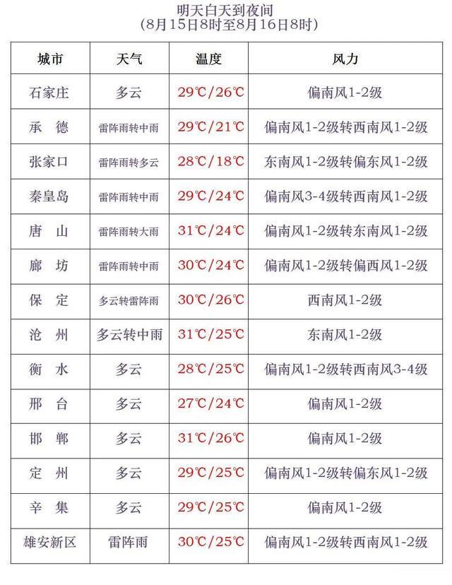 明天白天,保定、廊坊以北地区和石家庄西部、邢台西部、邯郸西部多云间阴有雷阵雨或阵雨,雷雨时局地伴有短时大风、短时强降水等强对流天气,其他地区多云间晴。
