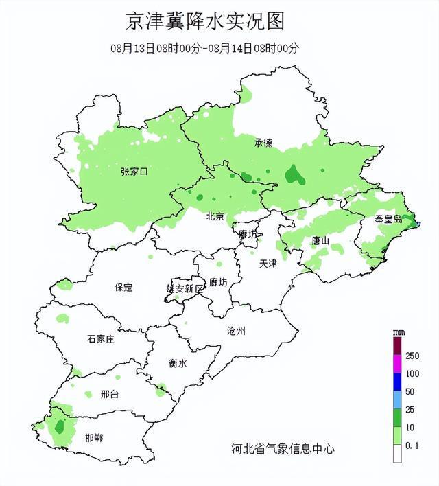 8月13日8时至14日8时,河北省北部地区、邯郸西部出现了分布不均的降水天气,根据国家站和区域站监测数据统计,共计100个县市区1125个监测站出现降水,其中暴雨1站,大雨6站,中雨63站,小雨1055站,其中最大降水量出现在秦皇岛山海关长城小学站,为83.8毫米(暴雨量级),最大小时雨强也出现在此站,为83.0毫米/小时,出现时间13日12时。