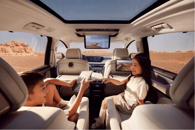 车内多处采用高品质材质,顶衬及 A/B/C 柱使用触感细腻的超细纤柔麂皮绒包裹;全车三排座椅均采用高级 Nappa 全粒面真皮,椅面运用绗缝工艺,花纹设计具有独特视觉效果。此外,车内配备 13mm 绒高的澳洲进口羊毛地毯、Smart Touch 光感触控板及 128 色礼宾氛围灯,提升了视觉与触觉体验。