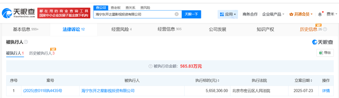天眼查天眼风险信息显示,近期,郑爽影视剧《翡翠恋人》出品方海宁东开之星影视投资有限公司新增一则被执行人信息,执行标的565万余元人民币,执行法院为北京市密云区人民法院。