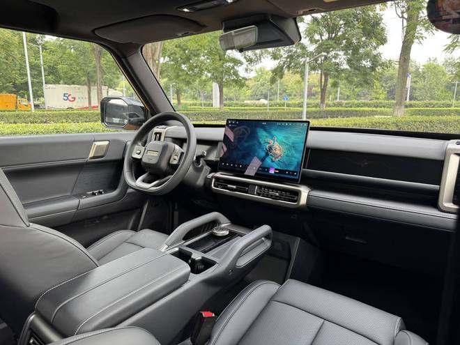 内饰设计上,设计风格简约大方,延续外观的机械感,中控台设计线条平直,搭配两侧为竖状空调出风口,视觉层次更丰富,中控台T字区域还设有把手,进一步增强内饰的越野氛围。
