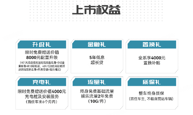 风云X3,购车可享金融礼、置换礼、充电礼、流量礼、质保礼等共计诸多购车权益,官方限时免费赠送价值8000元的配置升级礼,具体如下: