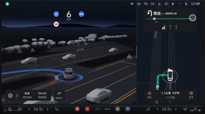 在NOA掉头功能中,系统可判断合适掉头时机并规划行驶路径,即便在繁忙三车道路口或无掉头标线环境下,也可实现最小化手动干预的掉头操作。