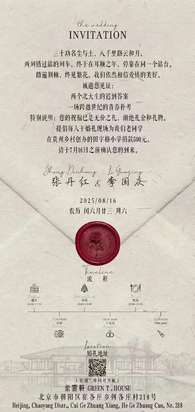 记者注意到,请柬特别说明:您的祝福已是无价之礼,谢绝礼金和礼物。提倡每人于婚礼现场为我们老同学在贵州乡村创办的田字格小学捐款500元。请于7月16日之前确认您的到来。