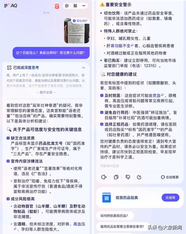 AQ依托蚂蚁医疗大模型的多模态技术,支持拍一拍"AI拍图打假"识别虚假医药广告。记者以一款"延年壮骨酒"进行拍照实测,上传图片后,AQ整合全网权威医学资料并完成深度思考,迅速给出"需特别警惕"的判断,并详细列举了缺乏合法资质、涉嫌违法宣传、成分风险极高等关键信息。