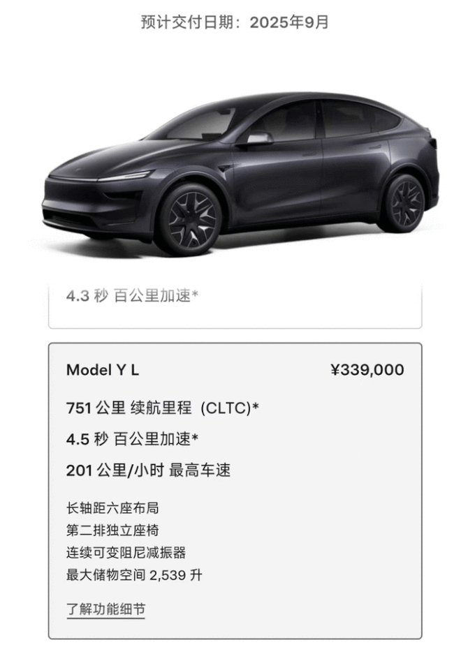 预计9月开启交付 特斯拉Model Y L售33.9万起