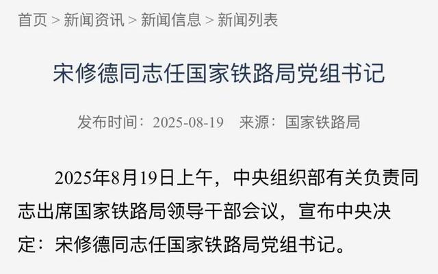8月19日上午,中央组织部有关负责同志出席国家铁路局领导干部会议,宣布中央决定:宋修德同志任国家铁路局党组书记。