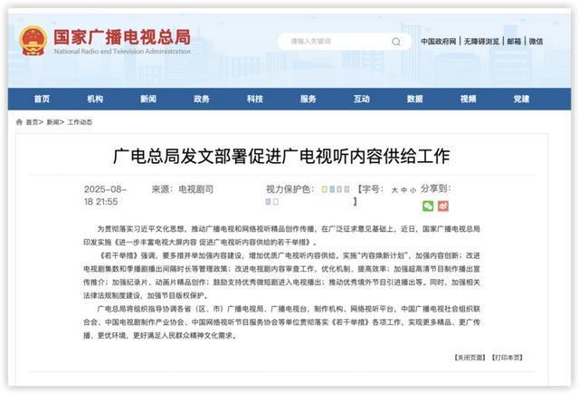 近日,广电总局印发实施《进一步丰富电视大屏内容促进广电视听内容供给的若干举措》(简称“广电21条”):试点实行电视剧中插广告,每集不长于30s;将根据剧目题材、内容和实际需要,不再简单限制电视剧40集的封顶要求,如果确实需要超过40集,总局将邀请相关人士进行审核,防止注水剧,严格把关;季播剧不再严格限制一年的播出时间;未来将根据实际和观众需求,推出更精准灵活的古装剧播出措施,推出“系列剧、情景剧和单元剧试行边审边播、边改边播,分集分单元反馈”的新机制。