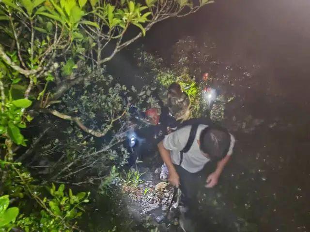 南澳森林消防中队队员梁明介绍:“一晚上下雨、刮风,全身都湿了,山上风很大、很冷,我们寻找他们的路是驴友开出来的野路,上去难度很大,只能抓着树木一步一步走。(下山)一路不是走下去,而是滑下去的。”