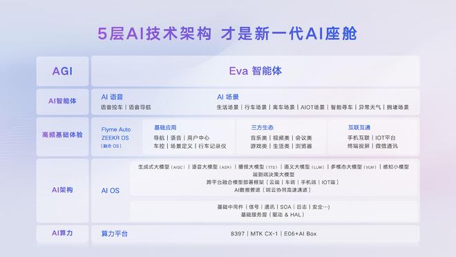 此次发布中,最受关注的是两个 “首个”:可大规模装车的超拟人智能体Eva,以及基于5层AI原生架构打造的新一代座舱操作系统Flyme Auto 2。